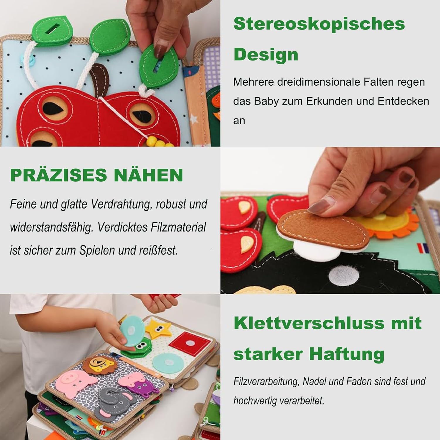 • Multiszenario-Nutzung: Dieses montessori buch filz Board hat die perfekte Größe von. Seine kompakten Abmessungen machen es ideal für kleine Hände und zu einem unverzichtbaren Reiseutensil. Ob beim Essen im Restaurant oder unterwegs im Auto oder Flugzeug, seine Tragbarkeit sorgt für Komfort. Halten Sie Ihr Kind beschäftigt und konzentriert und sorgen Sie gleichzeitig für Ruhe und Frieden für Eltern und Kind.