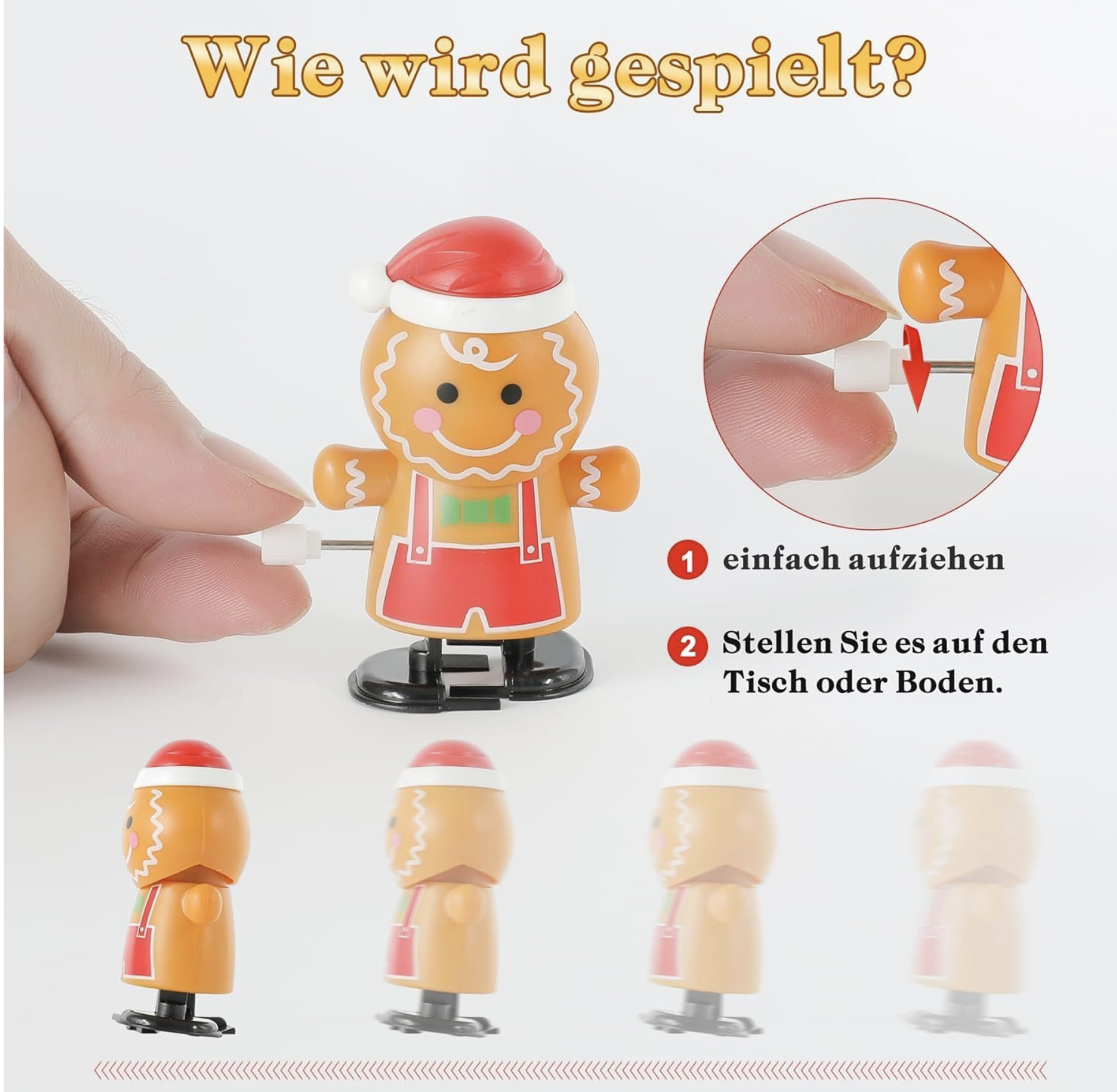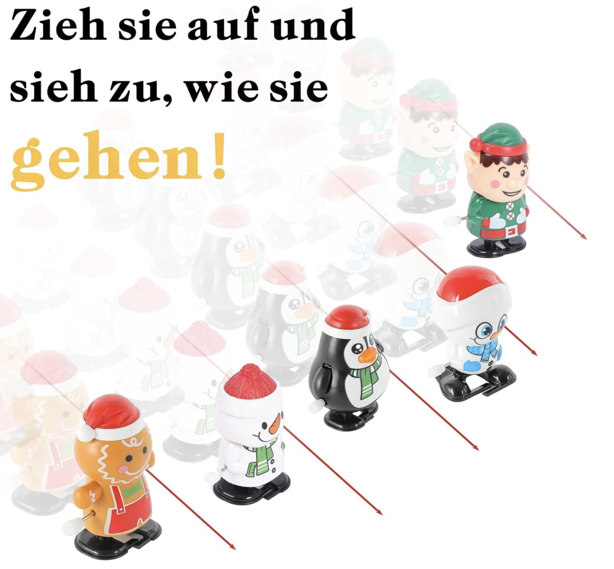 Die Figuren werden seitlich an einem Drehknopf aufgezogen, dann laufen sie über den Tisch. Die weihnachtliche Aufziehfigur ist ein ideales Geschenk für den Adventskalender.